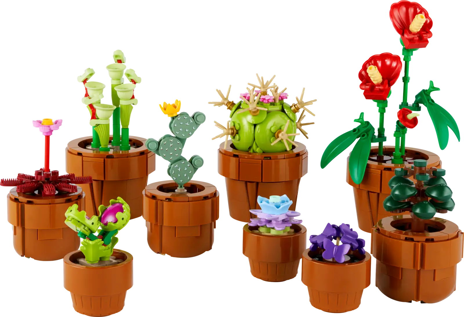 Je hebt geen groene vingers nodig als je deze 9 miniplantjes bouwt om vreugde in huis te halen. De LEGO® Icons Miniplantjes laten allerlei soorten uit de woestijn, tropen en zelfs vleesetende soorten zien. Elk plantje zit in en eigen terracottakleurig plantenpotje. Een prachtig cadeau voor fans van tuinieren en planten. Met verschillende modellen voor beginnende, ervaren en gevorderde bouwers is deze set het perfecte project om samen met vrienden en familie van te genieten.